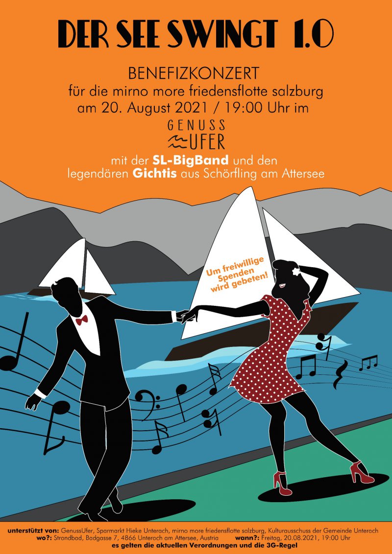 Benefizkonzert zugunsten der mirno more friedensflotte salzburg am 20. August 2021 / 19:00 Uhr im Strandbadrestaurant “GENUSS UFER” mit der SL-BigBand und den legendären “Gichtis” aus Schörfling am Attersee