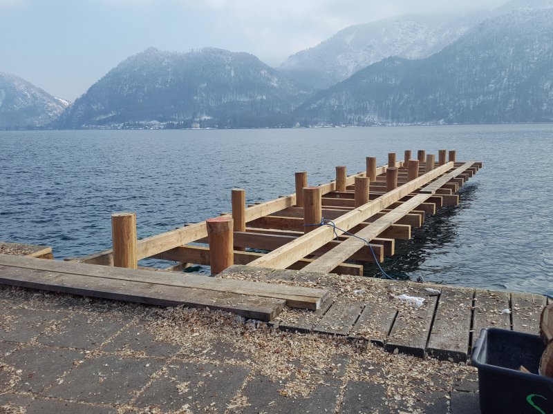 Auch die Errichtung des Steges mit der neuen Schiffanlegestelle geht zügig voran. Momentan ruht auf Grund der “sibirschen” Temperaturen (verständlicher Weise) die Arbeit.