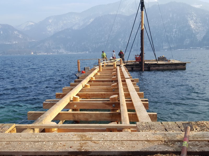 Heute gingen nach der “kältbedingten” Pause die Arbeiten an der Schiffsanlagestelle wieder weiter. Die Piloten des Querbalken der T-Form werden eingeschlagen.